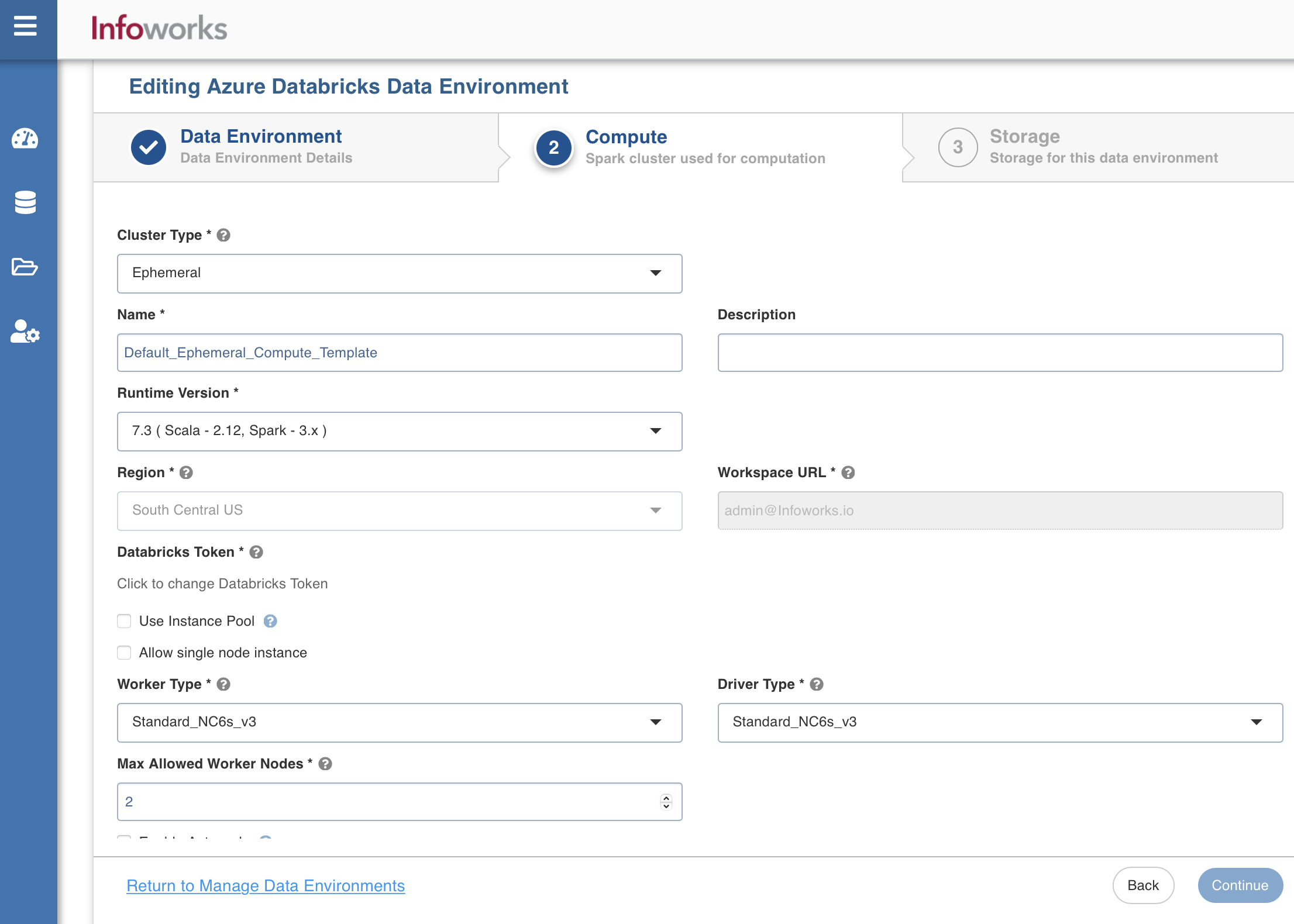 A compute template is the infrastructure used to execute a job. This compute infrastructure requires access to the metastore and storage that needs to be processed. To configure the compute details, enter values in the following fields. This defines the compute template parameters, to allow Infoworks to be configured to the required Azure Databricks instance.