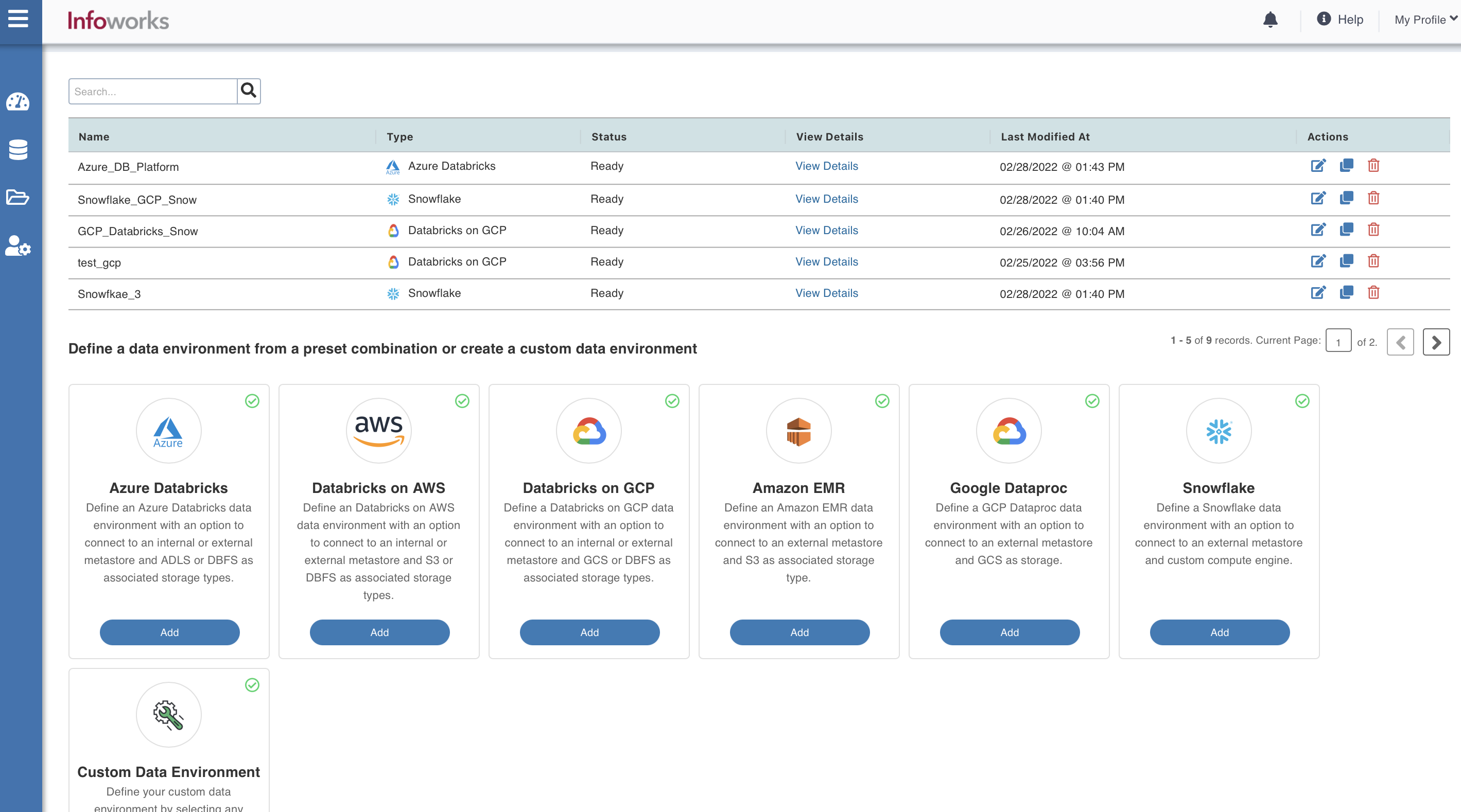 To configure and connect to the required Azure Databricks instance, navigate to Admin > Manage Data Environments, and then click Add button under the Azure Databricks option.