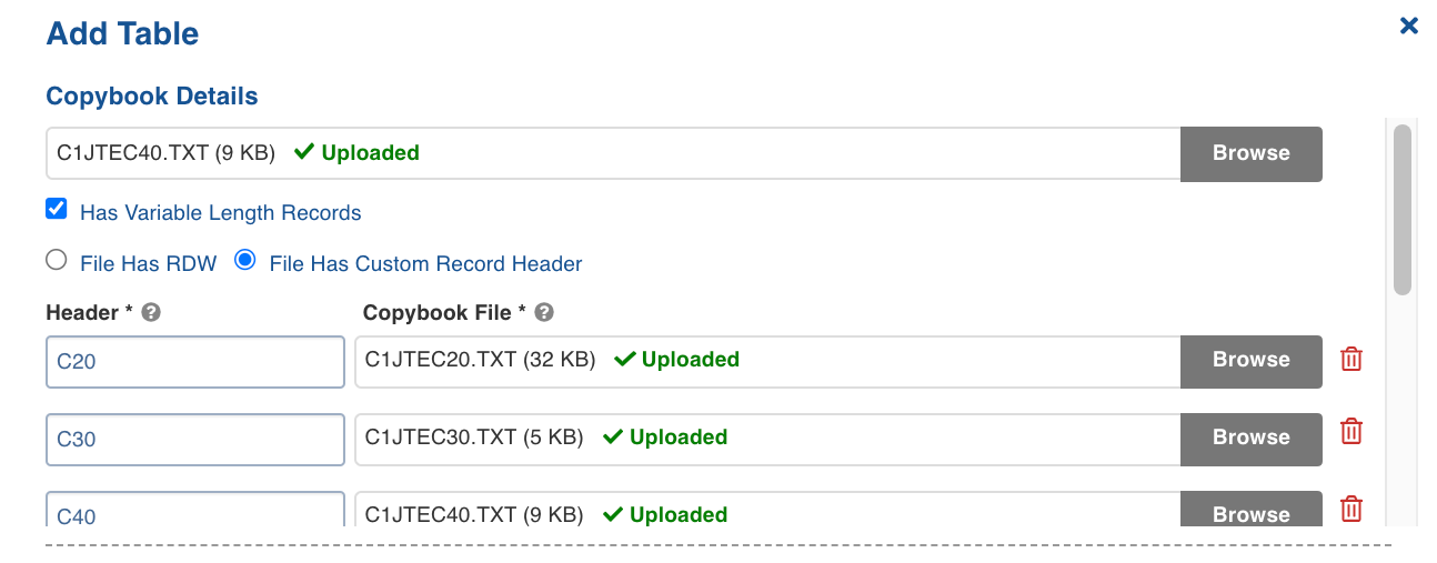 After the Copybook is uploaded, you can select File Has Custom Record Header and provide the following details: