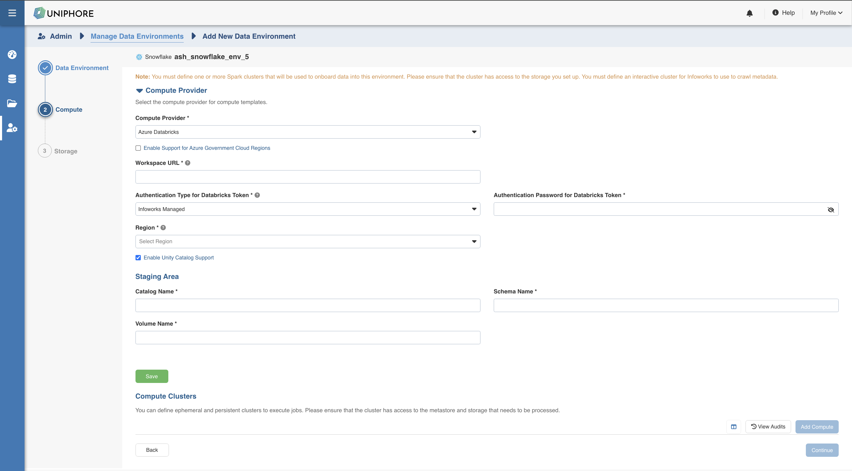 Infoworks supports creating multiple persistent clusters in an Snowflake environment, by clicking on Add Compute button.