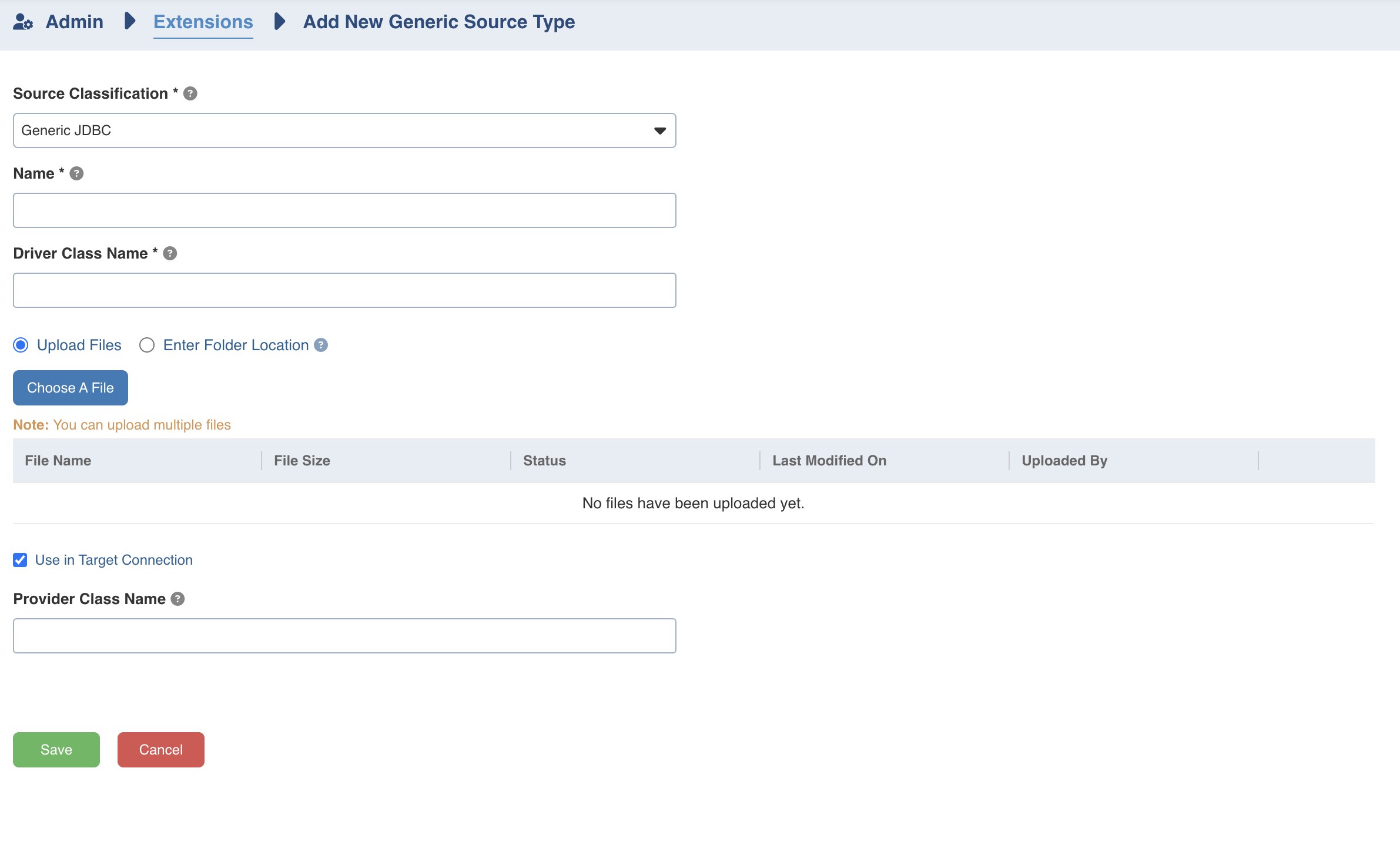 - Uploading a custom connector interface and specifying the implemented class name in the provider class name field, along with the uploaded JAR file, is not yet supported.