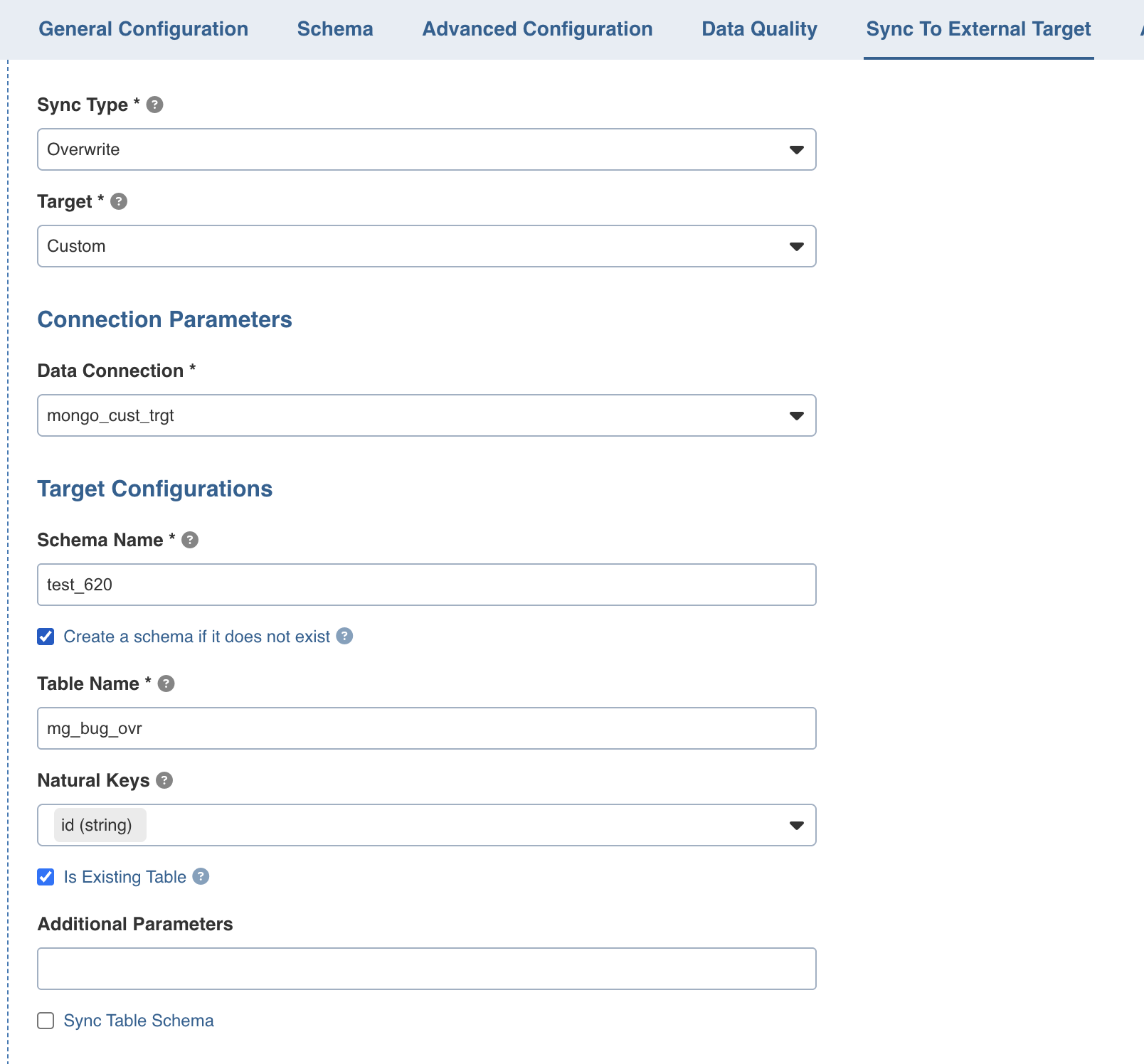 - Sync Table Schema is not supported for Custom Sync to Target.